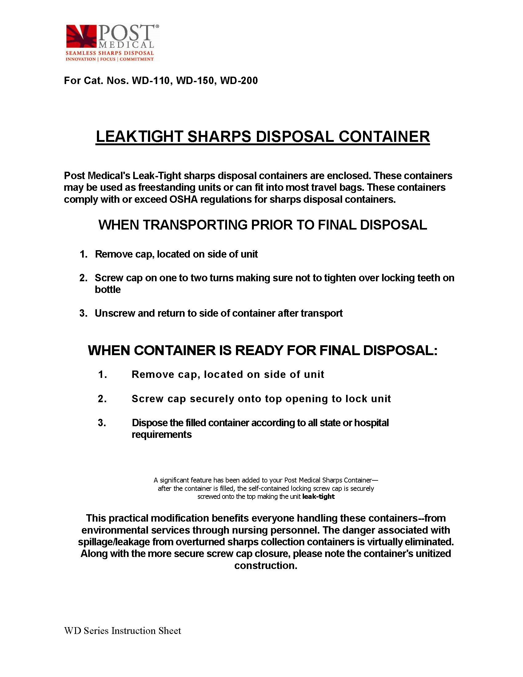• Only Post Medical WD-150 container seals to the Conseal! Cover’s internal mounting bracket for seamless disposal of sharps directly into the container.